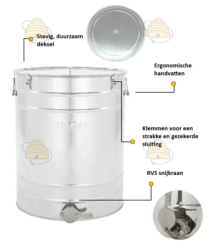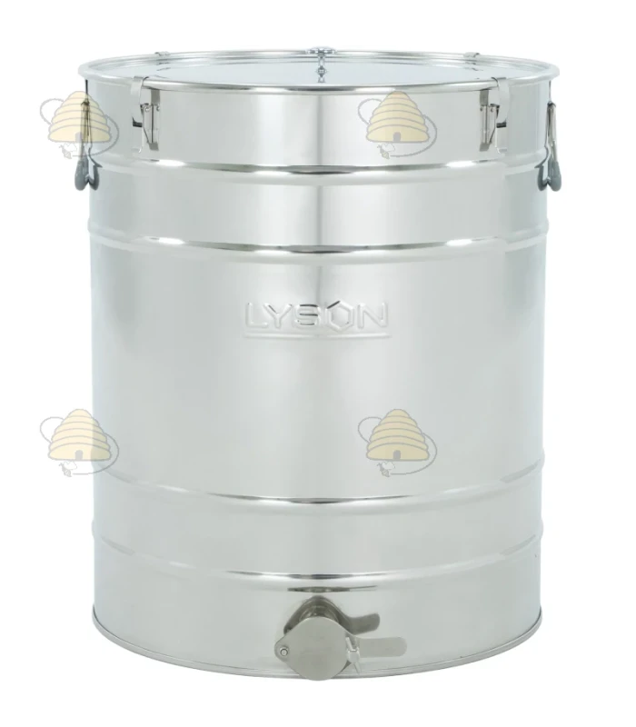 Darüber hinaus ist das Fass mit ergonomischen Griffen für optimalen Nutzungskomfort, Sicherheitsklemmen, die verhindern, dass der Deckel herunterfällt, sowie einem Silikonring im Deckelrand ausgestattet, der den Honig vor Feuchtigkeitsaufnahme und Verschmutzung von außen schützt.