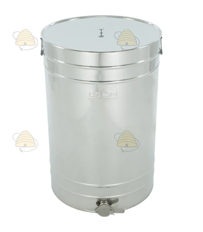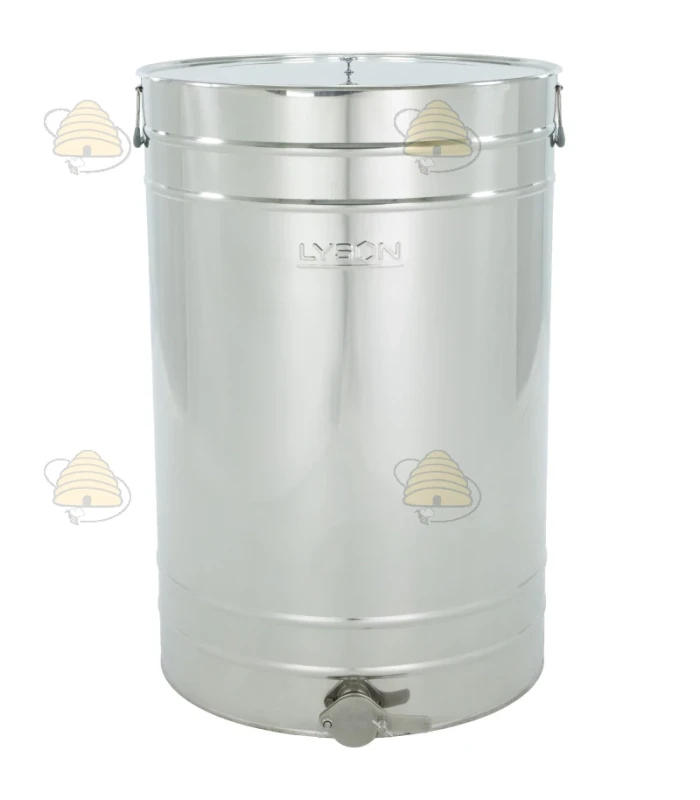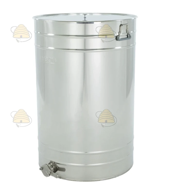 Dieser Behälter besteht aus lebensmittelechtem, hochwertigem Edelstahl und eignet sich für 300 Liter / 420 Kilo Honig. Es dient dank des 2" Edelstahl-Auslaufhahns / Quetschhahns an der Unterseite direkt auch als Abfüllbehälter.