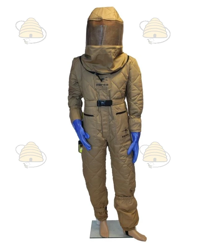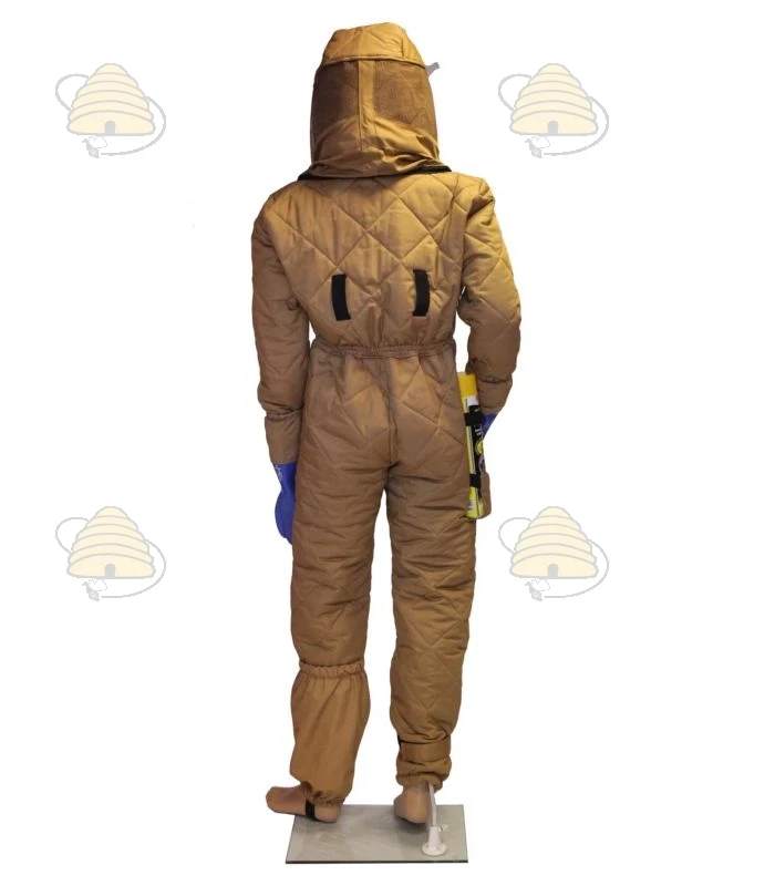 Komplettschutzanzug / Overall in beigefarbener Ausführung, der Ihnen optimalen Schutz vor der Asiatischen Hornisse bietet. Der Anzug ist mit Reißverschlusstaschen ausgestattet und besteht aus einem robusten, doppellagigen Stoff, der für außergewöhnlichen Schutz sorgt. Im Anzug befindet sich ein verstellbarer Kunststoffhelm mit einem Kunststoff-Gittervisier. Dieses stellt sicher, dass der Abstand zwischen dem Gitter und Ihrem Kopf konstant bleibt, sodass Stiche im Gesicht weitestgehend verhindert werden. Der Helm ist mittels Klettverschluss fest mit der Haube verbunden. Das Visier selbst besteht aus einem hochwertigen und stabilen Gittermaterial und bietet ein Sichtfeld von 180 Grad. Die Haube kann per Reißverschluss vom Anzug getrennt und separat gewaschen werden.