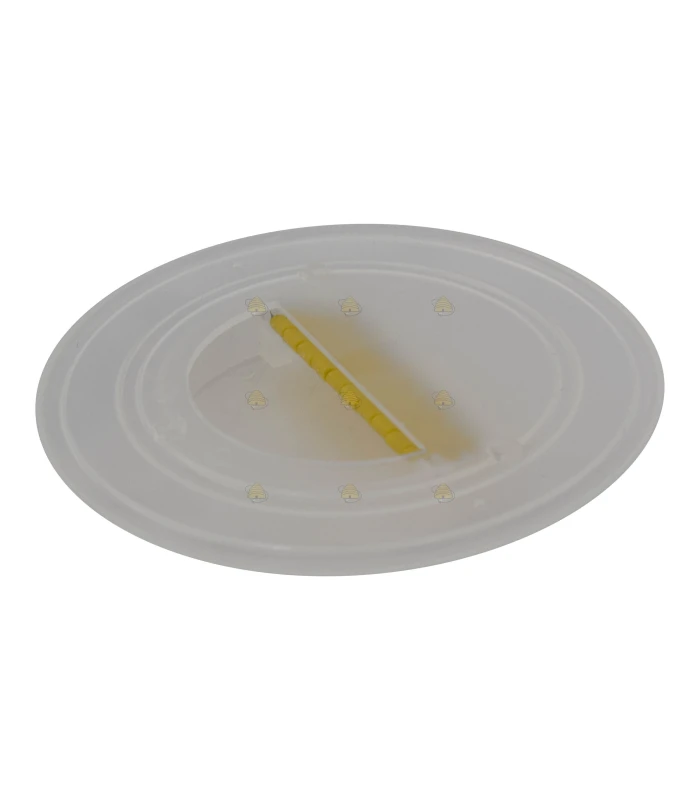Deutsches Modell Bienenflucht mit Klappen mit einem Durchmesser von 9,9 cm. Der Auslass ist mit einem kleinen Gitter versehen, so dass die Bienen leicht hinausgehen und nicht in den Honigraum zurückkehren können. Diese Bienenflucht ist für Abdeckplatten mit einem Futterloch von 7,5 cm bis 9 cm geeignet.