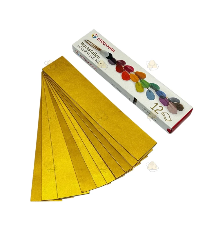 Paket mit 12 goldfarbenen Bienenwachsplatten / Bienenwachsstreifen zum Verzieren von Kerzen. Die Größe einer Streifen beträgt 20 cm x 4 cm. Durch die Wärme der Hand lässt sich das Wachs leicht in die gewünschte Form bringen. Außerdem können Sie Formen aus dem Wachs ausschneiden und auf eine Kerze aufbringen.