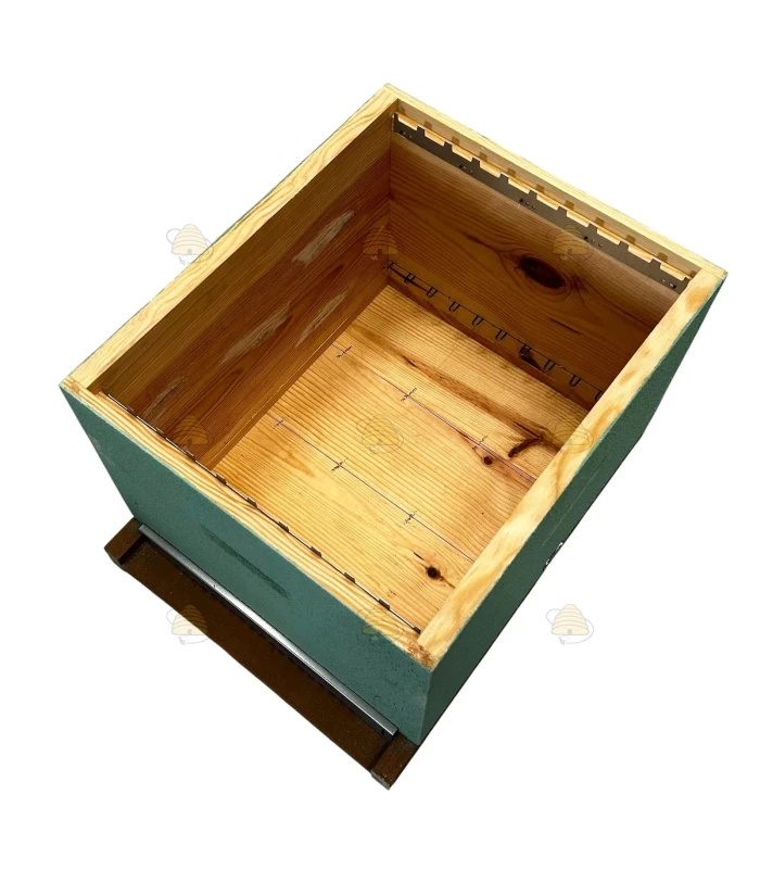 Die Brutzarge ist Meergrün lackiert. Die Rähmchen in der Brutkammer sind mit Nut / Sägeschnitt versehen, können aber selbstverständlich auch ohne Sägeschnitt / Nut verwendet werden. Dank der Abstandshalter und einer Kammleiste, am Boden der Brutkammer bleiben die Rähmchen ordentlich an ihrem Platz. Boden und Ganzzarge sind an den Seiten miteinander verbunden.