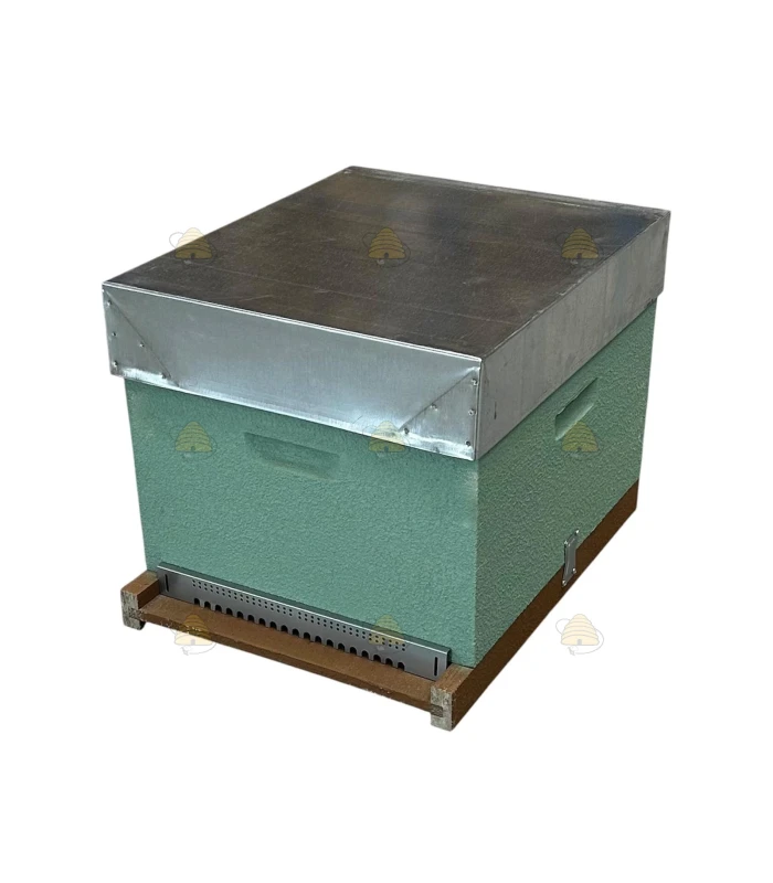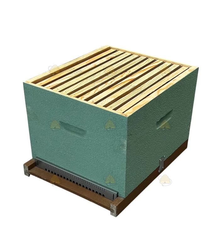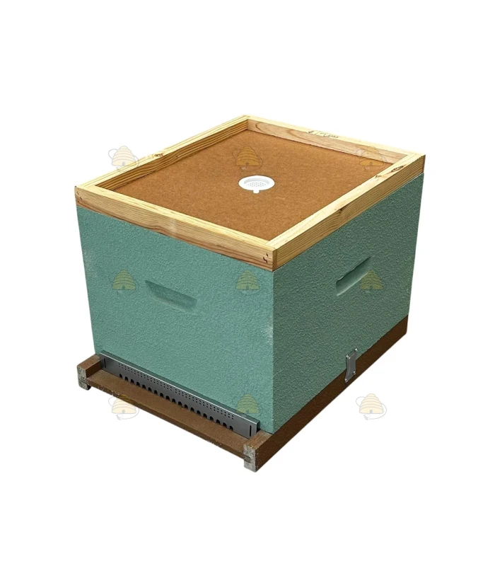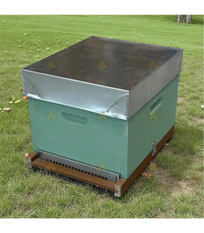 Fertige Dadant Blatt Holzbeute aus Kiefer, komplett geliefert und bereits in Meergrün lackiert.