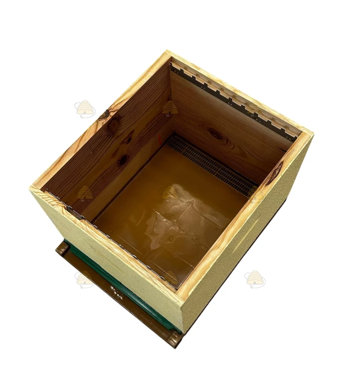Die Brutzarge ist pastellgelb lackiert. Die Rähmchen in der Brutkammer sind mit Nut / Sägeschnitt versehen, können aber selbstverständlich auch ohne Sägeschnitt / Nut verwendet werden. Dank der Abstandshalter und einer Kammleiste, am Boden der Brutkammer bleiben die Rähmchen ordentlich an ihrem Platz. Boden und Ganzzarge sind an den Seiten miteinander verbunden.