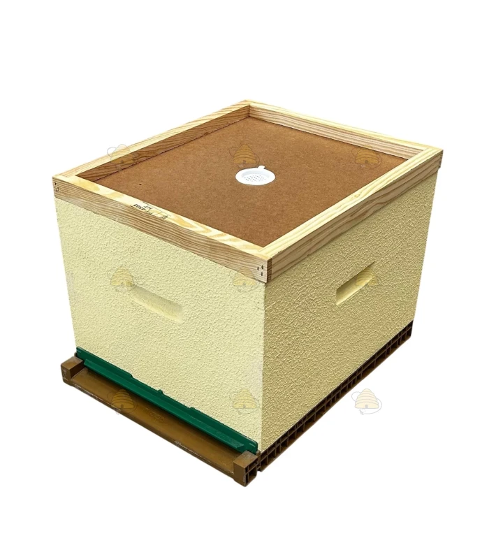 Fertige Dadant Blatt Holzbeute aus Kiefer, komplett geliefert und bereits in pastellgelb lackiert.
