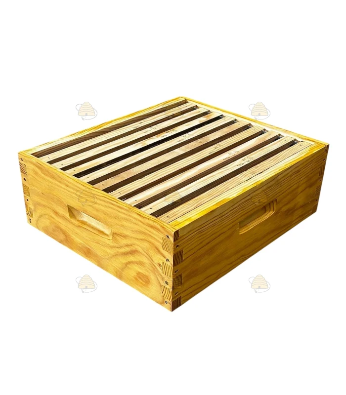 Fertige Dadant Blatt Honigzarge. Diese Honigzarge für die Dadant Blatt Beute ist bereits mit Leinöl imprägniert und mit 9 Rähmchen mit Sägeschnitt / Nut ausgestattet. Die Rähmchen können natürlich auch ohne Sägeschnitt / Nut verwendet werden. Die Honigzarge verfügt zudem über Abstandsleisten und ein Kammleiste, die dafür sorgen, dass die Rähmchen sicher und ordentlich an ihrem Platz hängen