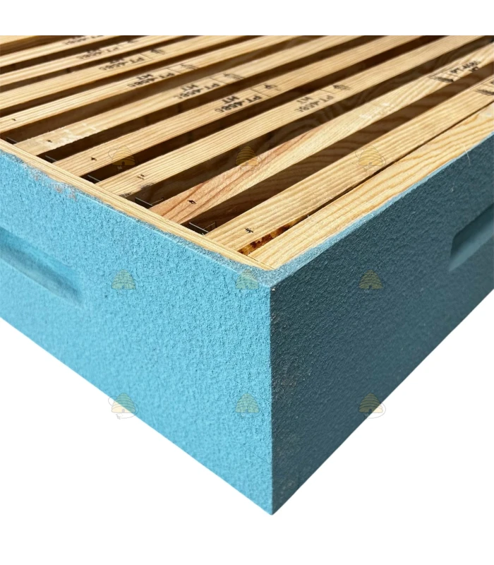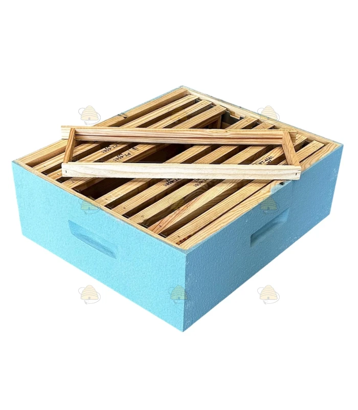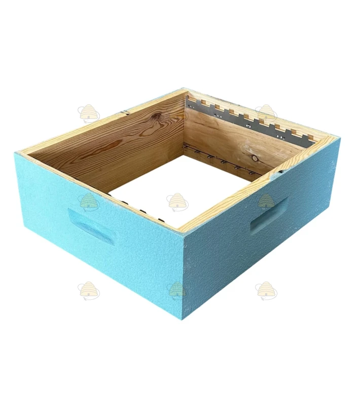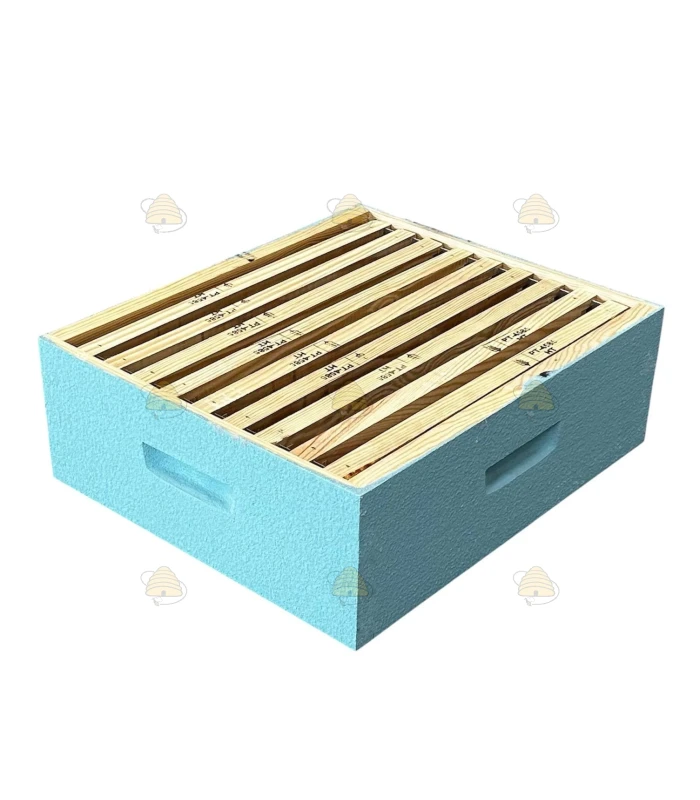 Fertige Dadant Blatt Honigzarge. Dieser Honigraum für die Dadant Blatt Beute ist in der Farbe Aquafarben lackiert und mit 9 Rähmchen mit Nut ausgestattet. Die Rähmchen können selbstverständlich auch ohne Nut verwendet werden.