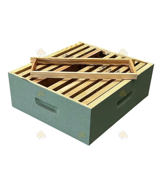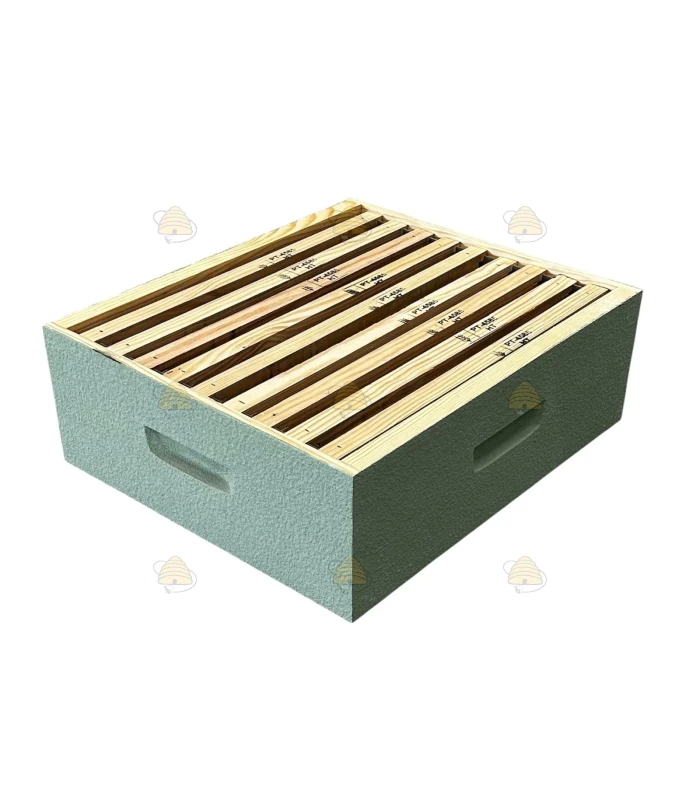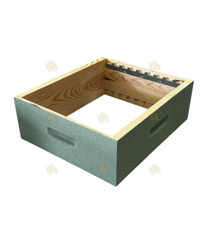 Fertige Dadant Blatt Honigzarge. Dieser Honigraum für die Dadant Blatt Beute ist in der Farbe Meergrün lackiert und mit 9 Rähmchen mit Nut ausgestattet. Die Rähmchen können selbstverständlich auch ohne Nut verwendet werden.