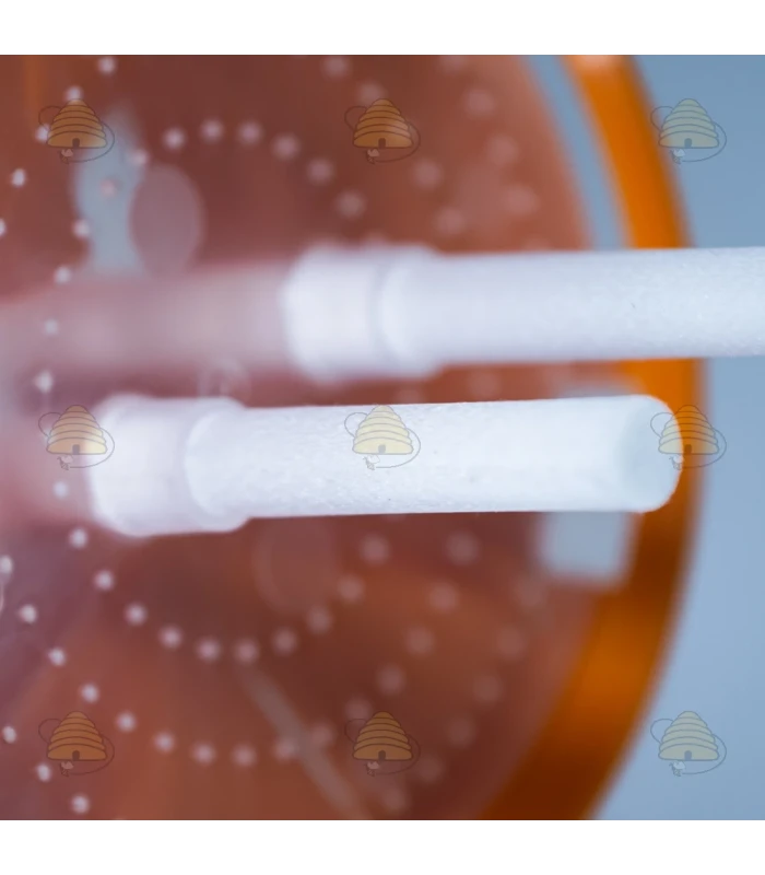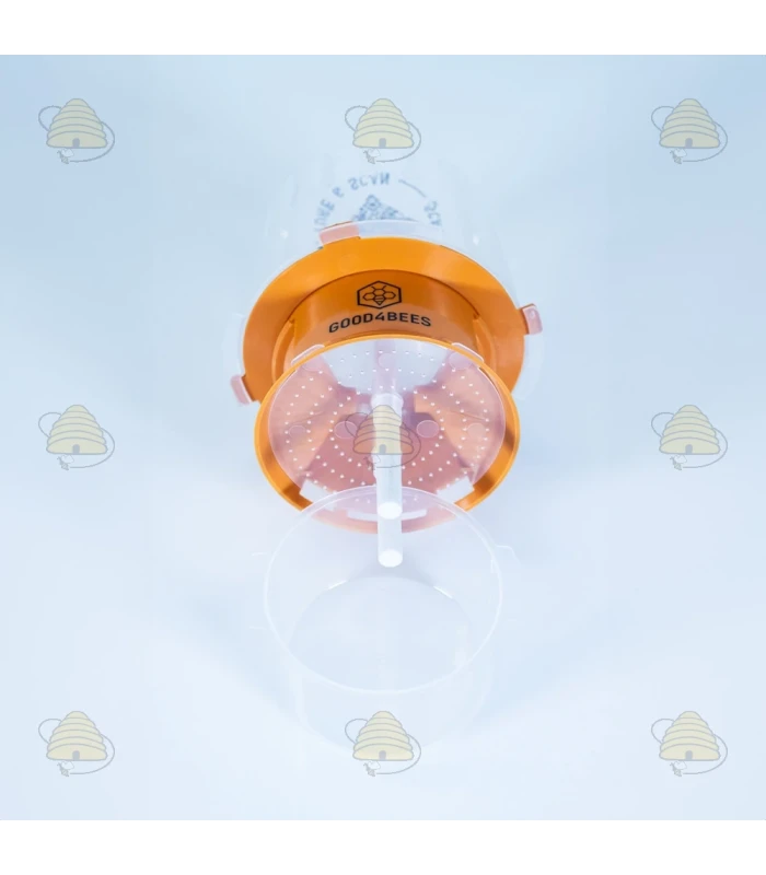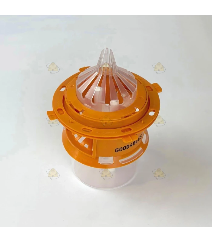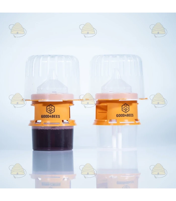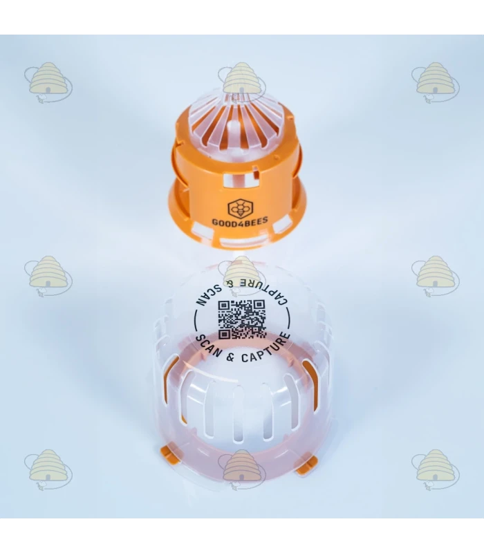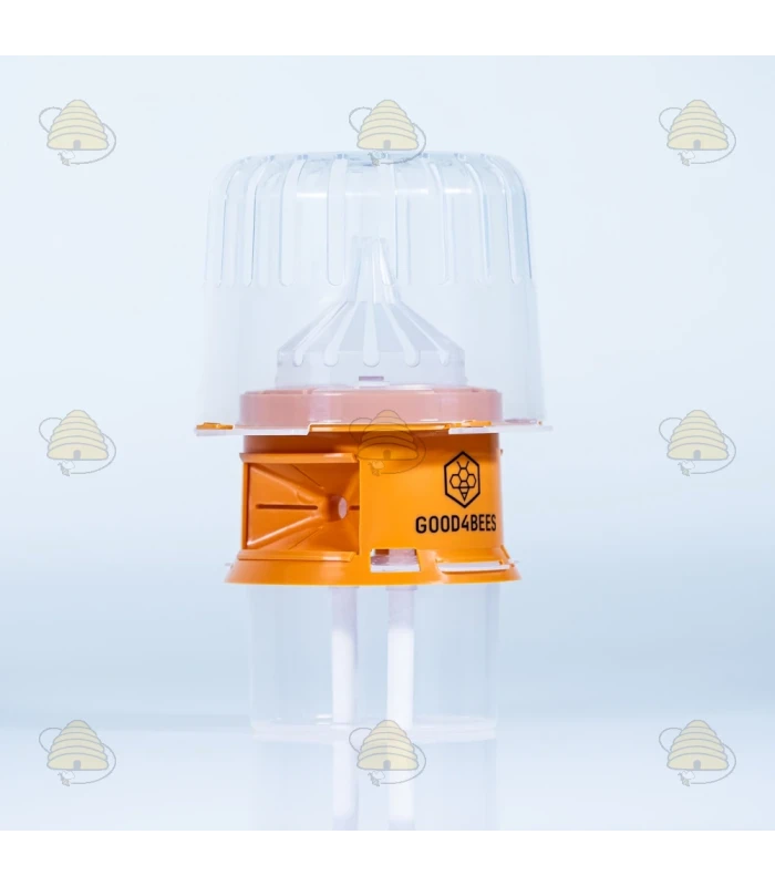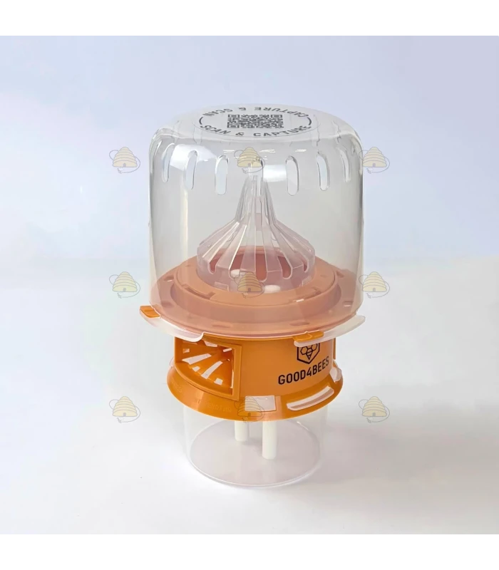 Selektive Hornissenfalle für die Asiatische Hornisse (Vespa velutina) der Marke Good4Bees, ausgestattet mit Absorptionsdochten, die den Lockstoff aufnehmen und als effektiver Diffusor wirken. Dadurch wird die Geruchsintensität verstärkt und die Lockwirkung erhöht.