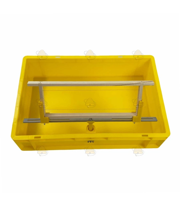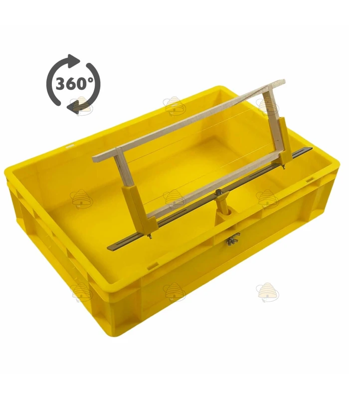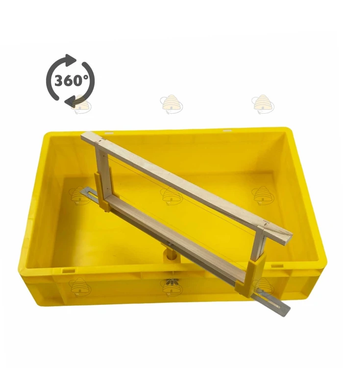 Dieser 360° drehbare Rähmchenhalter auf der Entdeckelungswanne der Marke Wendefix macht den Entdeckelungsprozess (Umdrehen der Rähmchen) einfacher als je zuvor. Das Entdeckelungsgeschirr ist für verschiedene Rähmchengrößen einstellbar, mit einer maximalen Rähmchenlänge von 48 cm und einer maximalen Leistenbreite von 26 mm an der Unterseite der Seitenlatte (auch Hoffmann-Rähmchen passen problemlos).