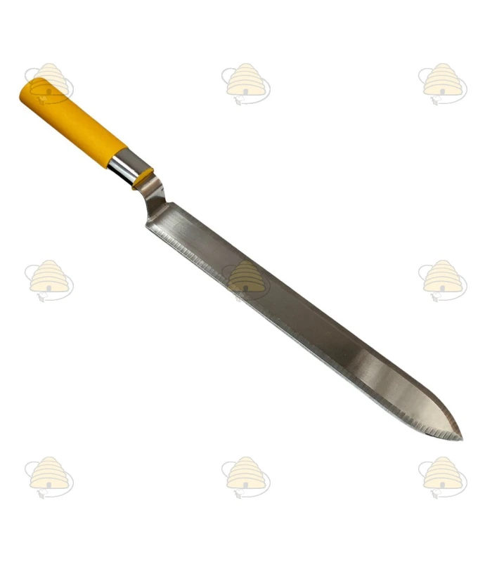 Entdecklungsmesser mit glatter Schneide. Die Gesamtlänge beträgt 42 cm und der Griff ist aus gelbem Kunststoff gefertigt. Die Schneidefläche hat eine Länge von 28,5 cm. Ein praktisches Messer zum schnellen Entdeckeln der Waben in den Honigräumen.