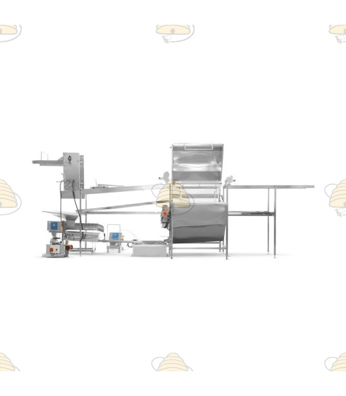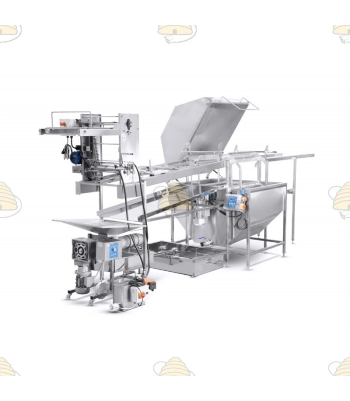 Komplette Honigverarbeitungsanlage aus säurebeständigem Edelstahl zur rationellen Honigernte. Die Anlage kombiniert Entdeckelung, Pressung, Förderung und Schleuderung in einem durchgängigen Arbeitsprozess.