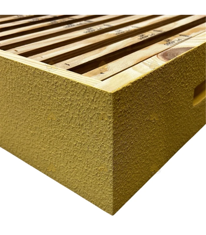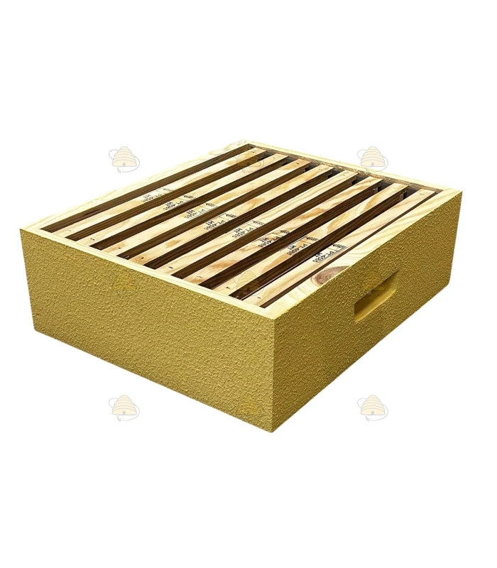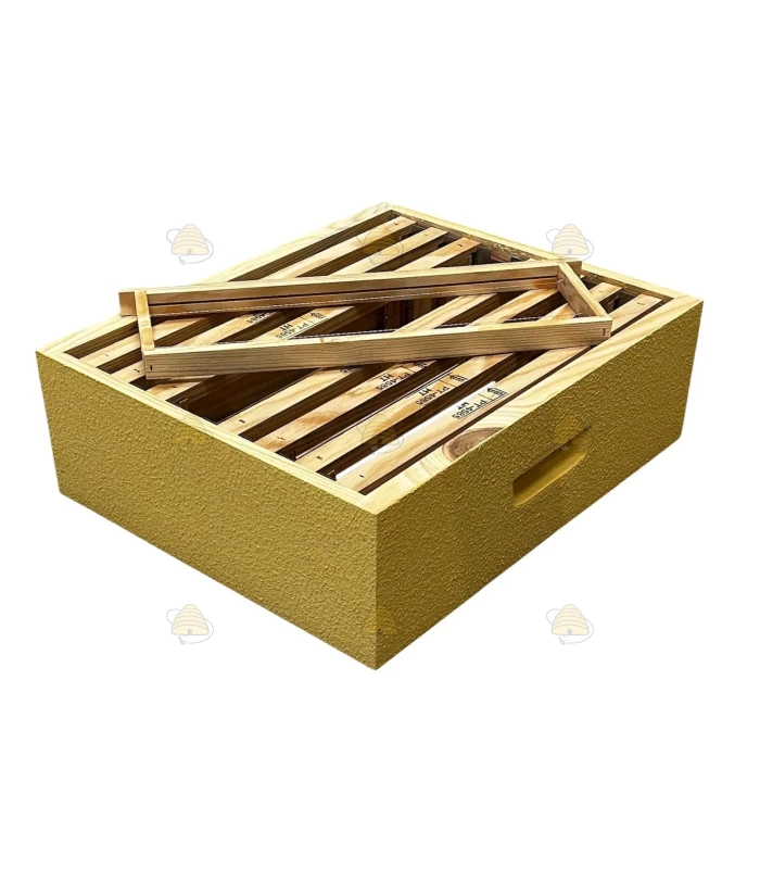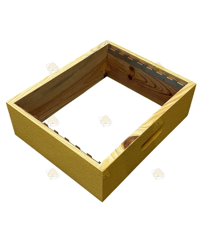 Fertige einwandige Langstroth US Honigzarge. Diese Honigzarge für die Langstroth Beute ist in Pastellgelb lackiert und mit 8 Rähmchen mit Nut ausgestattet. Die Rähmchen können selbstverständlich auch ohne Nut verwendet werden. Die Honigzarge ist außerdem mit Abstandstreifen versehen, die dafür sorgen, dass die Rähmchen ordentlich an ihrem Platz hängen.