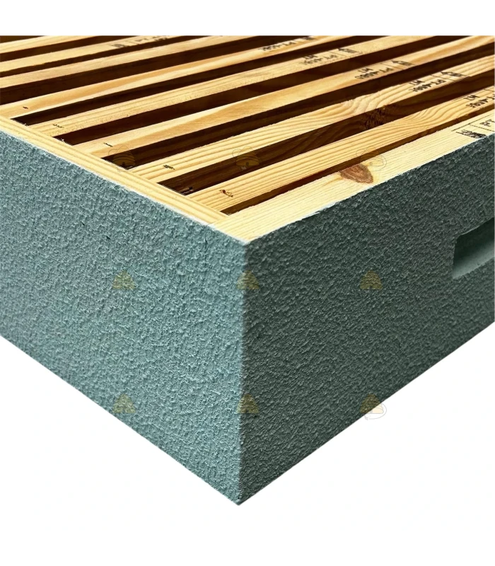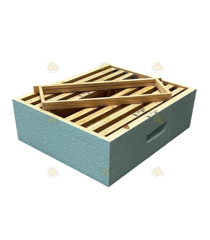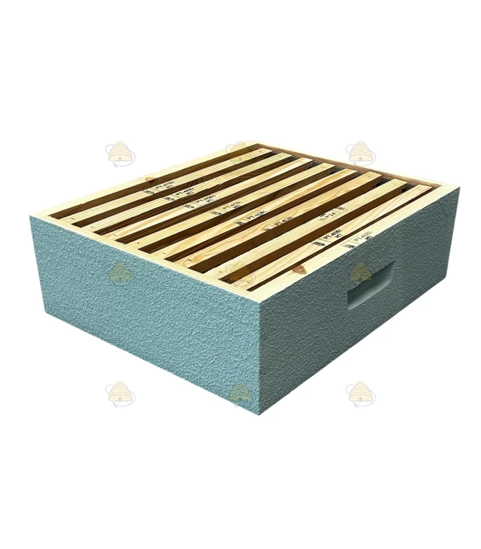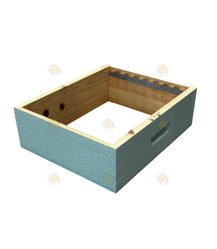 Fertige einwandige Langstroth US Honigzarge. Diese Honigzarge für die Langstroth Beute ist in hellblau lackiert und mit 8 Rähmchen mit Nut ausgestattet. Die Rähmchen können selbstverständlich auch ohne Nut verwendet werden. Die Honigzarge ist außerdem mit Abstandstreifen versehen, die dafür sorgen, dass die Rähmchen ordentlich an ihrem Platz hängen.