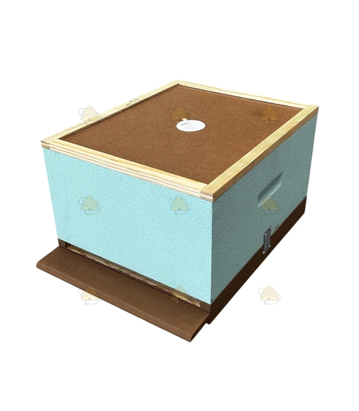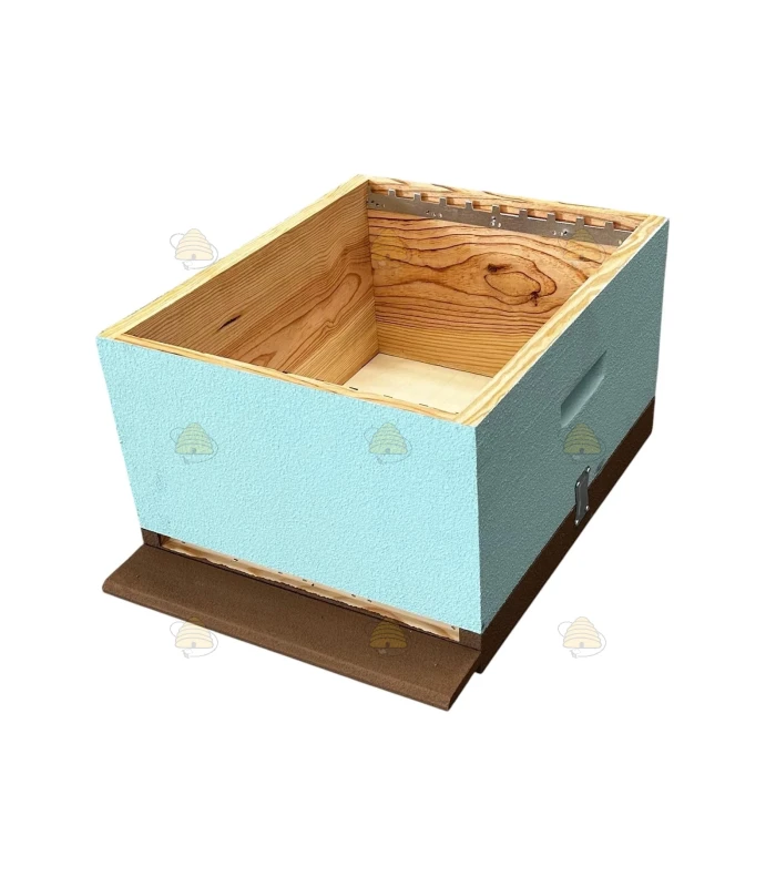 Die Brutzarge ist hellblau lackiert. Die Rähmchen in der Brutkammer sind mit Nut / Sägeschnitt versehen, können aber selbstverständlich auch ohne Sägeschnitt / Nut verwendet werden. Dank der Abstandshalter und einer Kammleiste, am Boden der Brutkammer bleiben die Rähmchen ordentlich an ihrem Platz. Boden und Ganzzarge sind an den Seiten miteinander verbunden.
