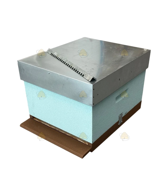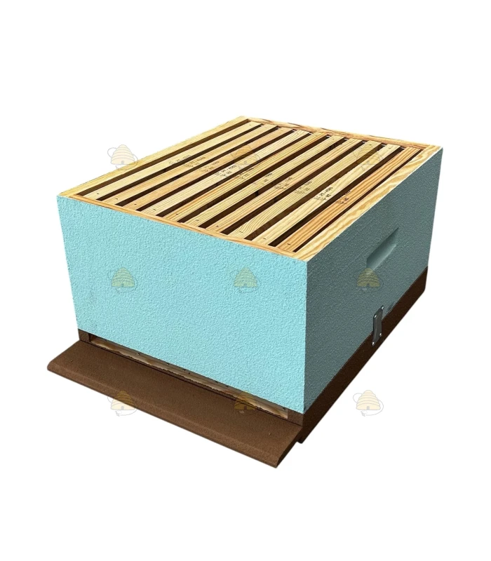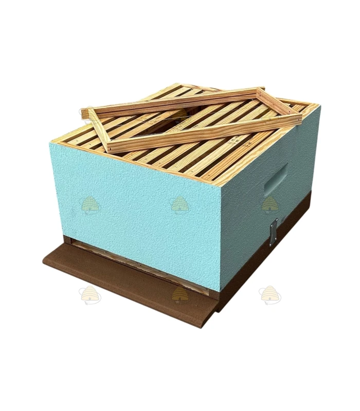 Fertige, einwandige Langstroth US Beute aus Kiefernholz, komplett geliefert und bereits hellblau lackiert.