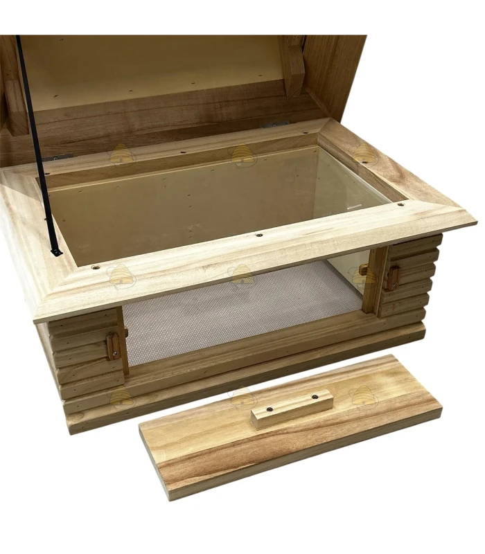 Das Kästchen ist mit einem Sichtfenster ausgestattet, das mit einer Glasscheibe versehen ist. Dieses kann durch ein kleines Holzplättchen geöffnet und geschlossen werden.