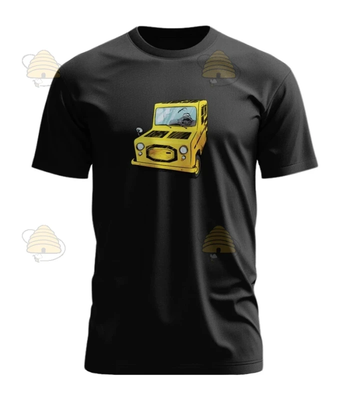 Schwarzes T-Shirt mit einer Illustration eines Microcar Pat und einer Biene am Steuer.