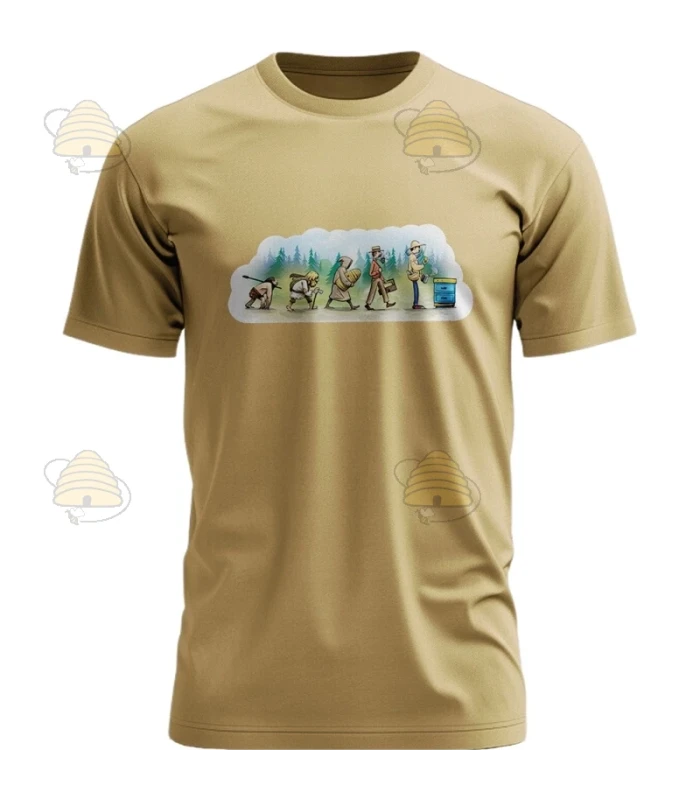 Beiges T-Shirt mit Illustration der Entwicklung des Imkers – vom ersten primitiven Imker bis zum modernen Imker. Eine Hommage an die jahrtausendealte Beziehung zwischen Mensch und Biene.