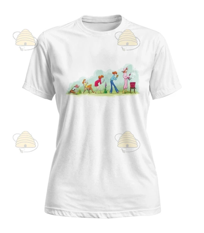 Weißes T-Shirt mit einer Illustration der Entwicklung der Imkerin – von der ersten primitiven Imkerin bis zur modernen Imkerin.